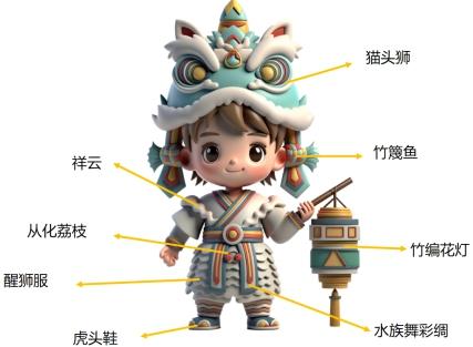 这当中,IP形象“绒小狮”格外引人注目。团队成员介绍,这个IP形象的灵感主要来源于从化本地的“猫头狮舞”。猫头狮又叫客家狮、獬、豸,是从化特有的狮舞品种,流传至今已有300多年历史,是当地一些客家村落逢年节庆典、传统仪典时不可少的元素。猫头狮的狮头形状似猫,造型较一般本地狮个头小,双目突出如金鱼眼,扁圆形的大口凶不怒,头顶插着两束青葱的麦草,造型和表演生气盎然,温顺厚道,颇具“萌”感。