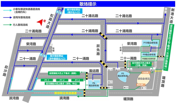 深圳、中山方向自驾观众:建议由深中通道南沙联络线南沙南收费站或南沙湿地收费站下高速(或由万环西路),经虹霞大道前往P5、P6停车场停放,沿行人通道前往南验票口。