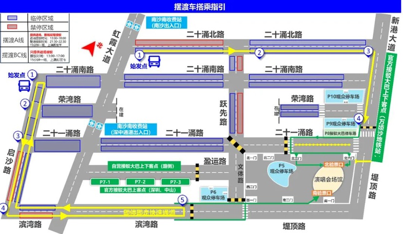 广州方向自驾观众:建议由南沙港快速新龙收费站下高速(或由灵新大道),经新港大道前往P9、P10停车场停放,沿行人通道步行前往北验票口。