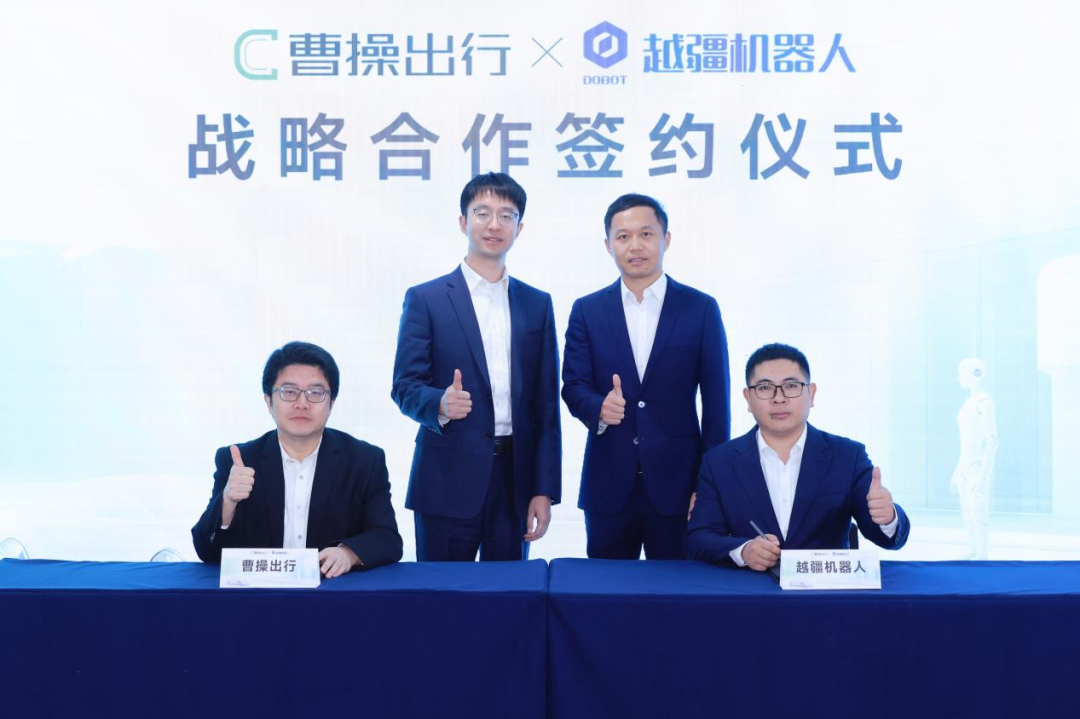 曹操出行CEO龚昕,越疆科技创始人、董事长兼CEO刘培超,曹操出行CTO强琦,越疆科技联合创始人兼副总经理刘主福共同出席签约仪式。
