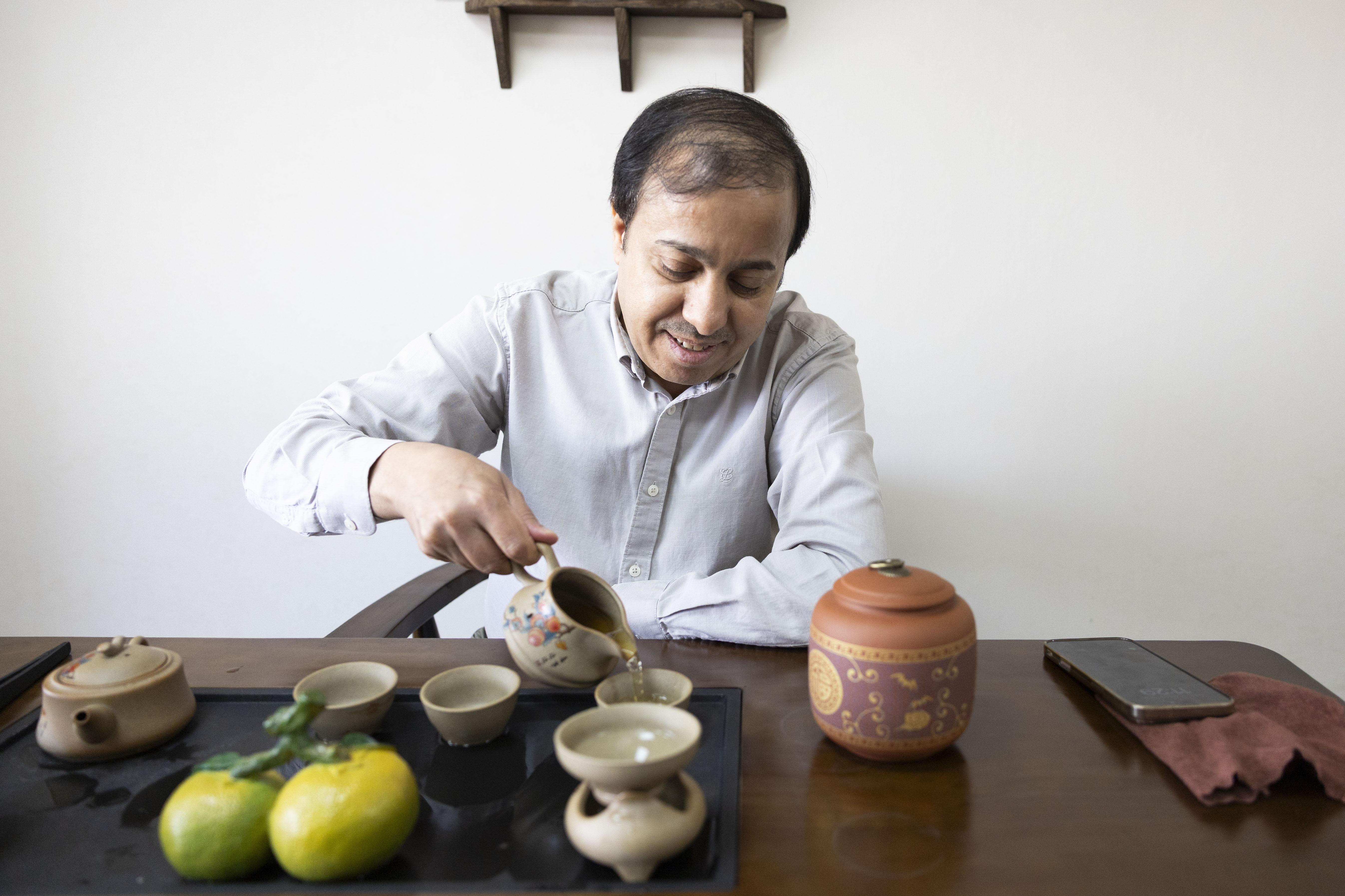2021年,Hesham将创办的广州市百维贸易有限公司从蓝宝石大厦搬入花园大厦,公司所在的12楼将环市东的街景尽收眼底,两间小小的办公室能创造两三千万元的年交易额。发财树、茶桌、茶具、各种茶叶……“广东老板”的标配这里都有,Hesham熟练地烧水、泡茶、斟茶,“这些都是我从芳村茶叶市场采购的,我们常去买一些红茶、人参茶。”Hesham说,阿拉伯人会在红茶里加糖,但他已经习惯了不加糖的广东红茶。