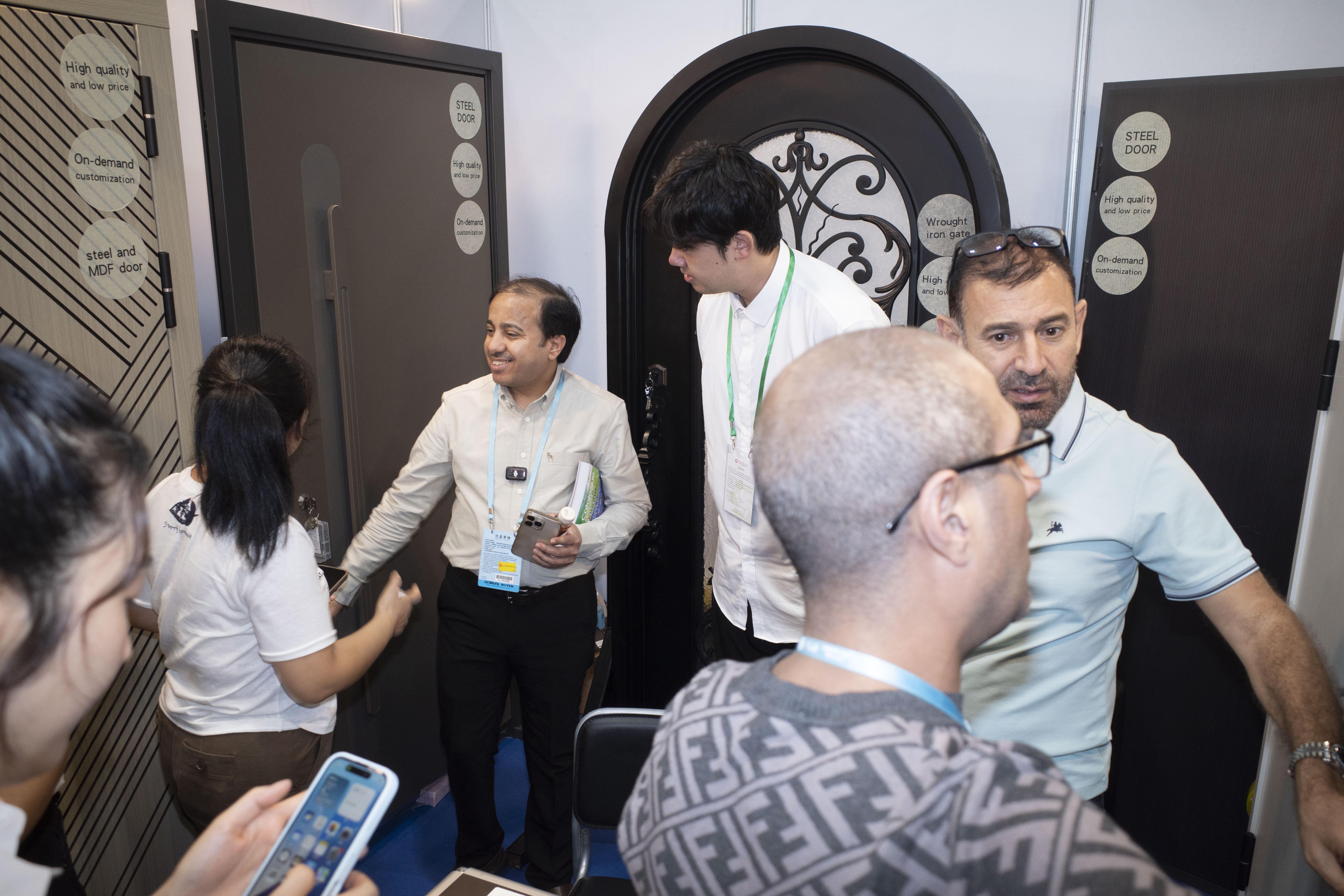 Hesham从佛山的瓷砖、家具,云浮的大理石,讲到福建的石材、浙江永康的门窗……他的身影穿梭在各种石材、地砖地板、门窗之中,目光一直在寻找。“我想找应急门。虽然已经有一家供应商,但还是想再找一家比对一下。”Hesham说。碰到感兴趣的产品,他会停下脚步,摸一摸、问一问,再去索要参展商的微信,“以前要拿行李箱装各种产品手册,现在加上微信就能获取电子版手册,特别轻松。”