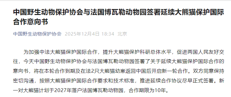 据“中国野生动物保护协会”12月4日消息,为加强中法大熊猫保护国际合作,提升大熊猫保护科研总体水平,促进两国人民友好交往,今天中国野生动物保护协会与法国博瓦勒动物园签署了关于延续大熊猫保护国际合作的意向书,将在本轮合作到期及在法2只大熊猫幼崽返回中国后开启新一轮合作。双方同意保持密切沟通,按照大熊猫保护国际合作要求和技术标准,推进延续合作协议尽早正式签署。新一对大熊猫计划于2027年落户法国博瓦勒动物园,合作期限为10年。