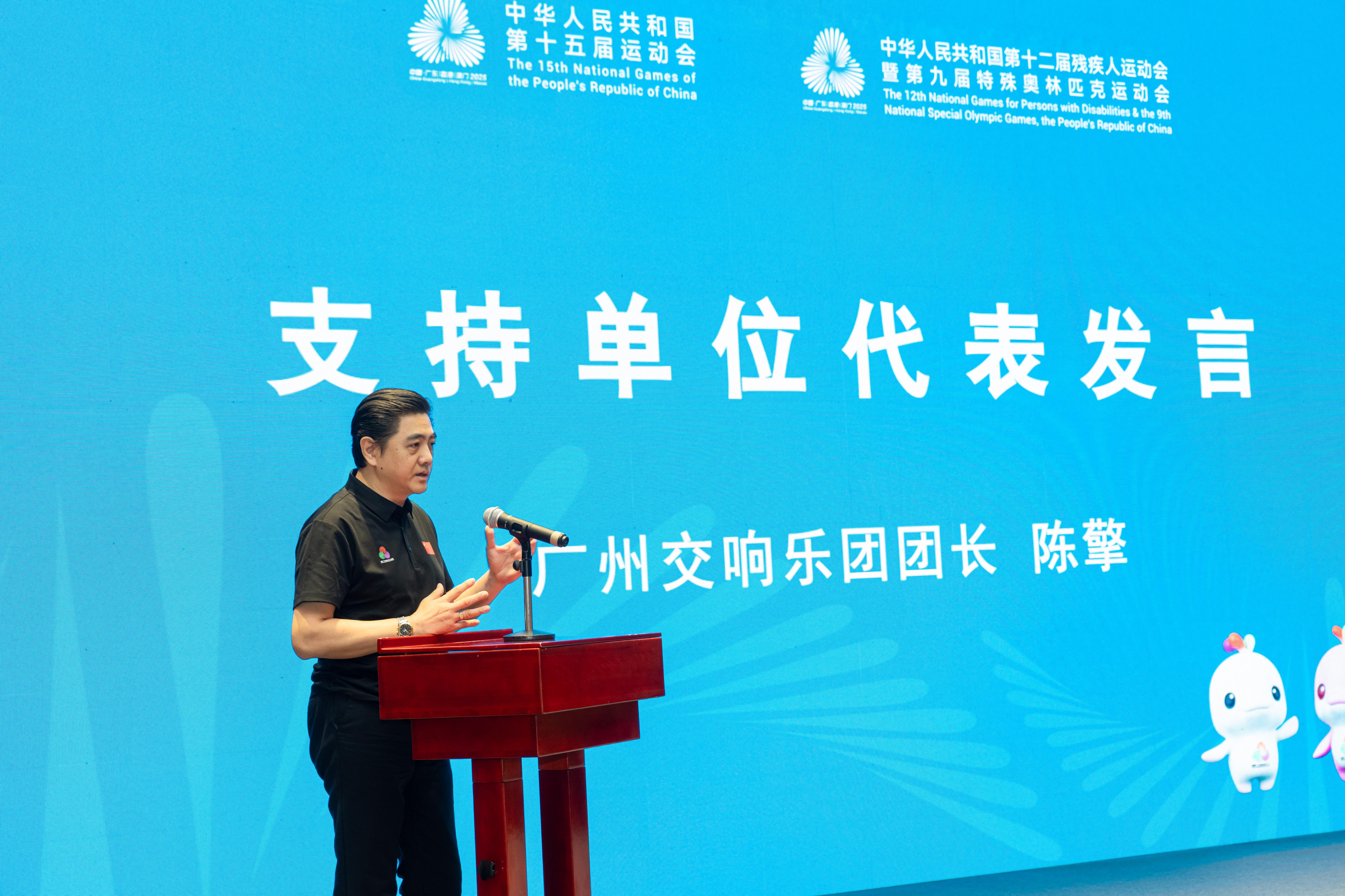 作为贡献单位代表,广州交响乐团团长陈擎在发言中表示,能以其艺术资源为国家级体育盛会贡献力量倍感荣幸,各支持单位通力合作,共同为赛会注入了丰沛而优质的声音能量。陈擎认为,体育赛事是广东文化艺术成果很好的展示平台。