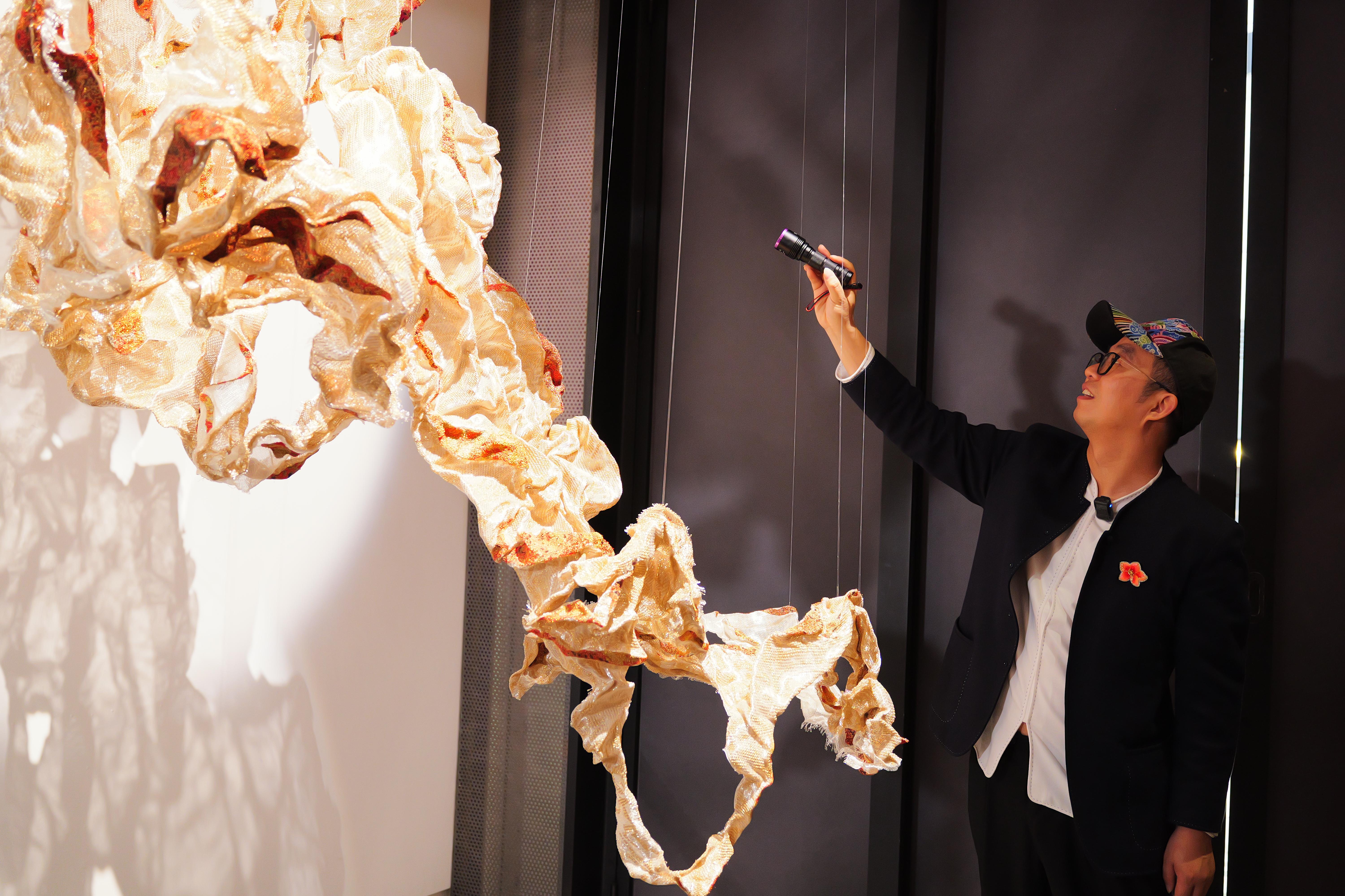 另一方面,王新元更是把中国原创的AIE荧光新材料变成绣线,加入艺术品之中。这项技术的引入,为作品赋予了双重生命:在自然光下,它是素雅恢宏的当代山水;当紫光灯亮起,凝聚于丝线中的发光粒子便被瞬间唤醒。而这束光中,更藏着王新元埋下的诗意“彩蛋”——他特意在作品中“藏”入了一颗星星、一个笑脸、一只兔子等图案。当观众手持紫光灯,如同探秘般在作品上寻找、照亮这些隐藏的记号时,光便成了可被激发、可互动的游戏。王新元表示,这不仅是装饰性的发光,更是以“光”为媒介,对“气韵生动”这一东方美学进行的、充满趣味与温度的当代转译。