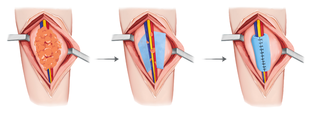“肿瘤‘粘连’血管神经,完整手术切除难度大,并且很容易复发。为此,传统的手术方式为了把肿瘤切干净,常常会牺牲患者的肢体,或者在患肢嫁接别处的血管和神经,这些方法对患者而言无疑是巨大的打击。”肿瘤的营养供应来自周边微血管,可否将血管与肿瘤隔离开来,这样既能“切瘤”,也能保护神经和血管。带着这样的想法,尹军强团队巧妙地实施了“隔离手术”——利用生物材料补片将受累的神经血管包裹隔离,同时还有神经血管自身的鞘膜作为天然屏障加持,能在保护功能的前提下最大限度地切除肿瘤。