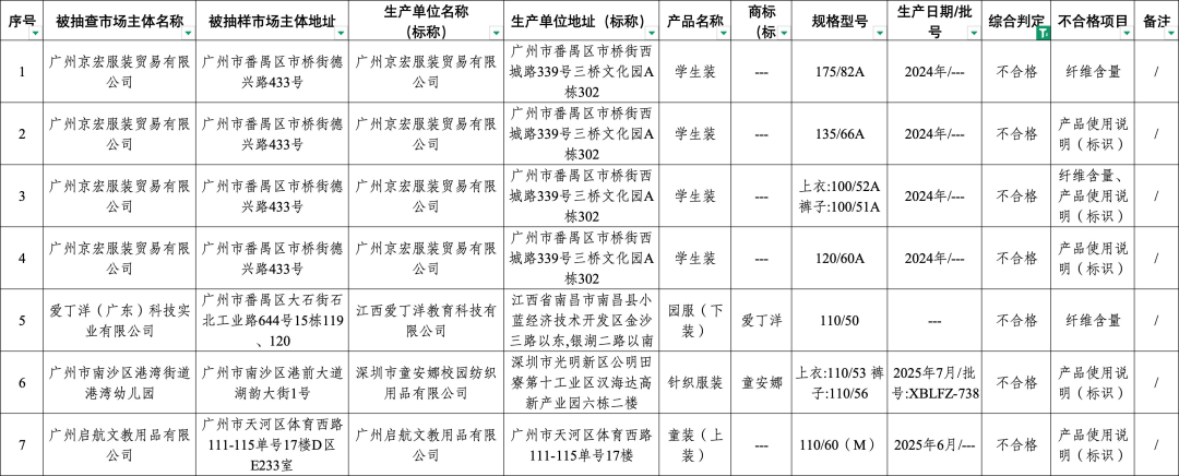 12月4日,广州市教育局官网发布《广州市市场监督管理局 广州市教育局关于2025年广州市中小学生校服(含幼儿园园服)产品质量监督抽查情况的通告》。通告显示,相关单位本次监抽了50家广州市行政区域内中小学生校服(含幼儿园园服)产品生产者、销售者、学校生产销售的256款中小学生校服(含幼儿园园服),发现不合格产品7批次,不合格产品发现率为2.73%,其中实物质量不合格3批次。