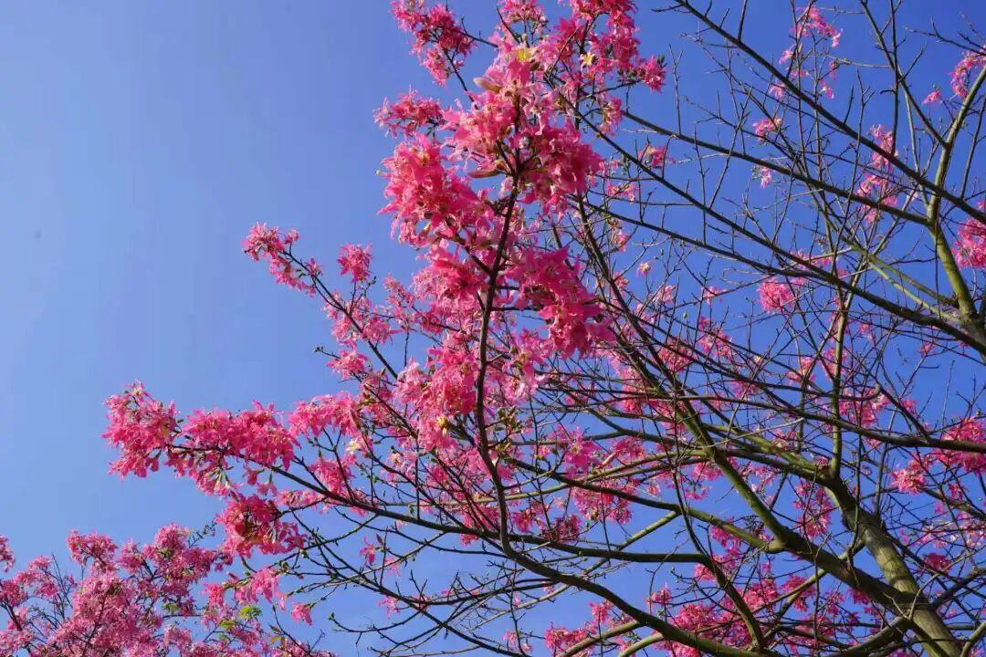 异木棉沿着河堤盛开,市民可以在河边拍照打卡。