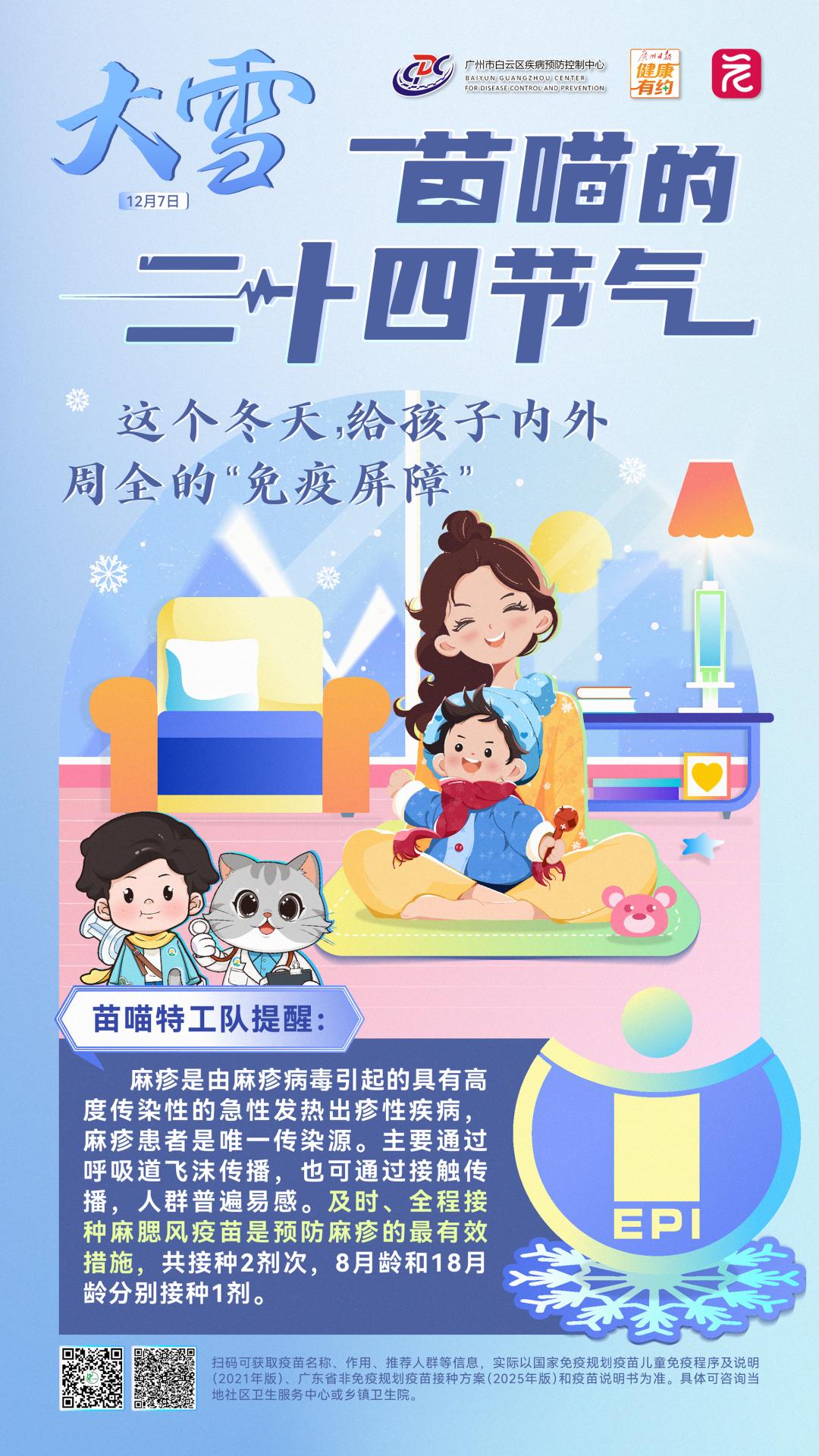大雪时节,广州市白云区疾病预防控制中心预防接种科普IP“苗喵特工队”带大家认识一位冷酷的“狠角色”——麻疹。