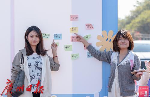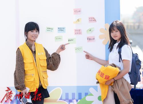 广州专场,为招聘会服务的广外学生在心愿墙上贴上祝福卡片。