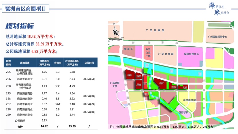 公告披露,琶洲南区商圈项目位于广州(琶洲)国际会展中心以南,地处琶洲南区创新融合区核心,北望黄埔涌,坐拥稀缺滨江绿色景观资源。项目交通网络发达,拥有“一个口岸、两条城轨、五条地铁、多条主干道路”的立体化格局,30分钟可达城市重要交通枢纽,2小时辐射粤港澳大湾区主要城市及港澳地区,区位优势极其显著。项目的战略定位清晰——旨在打造集“数字、会展、总部”产业全球高地及国际消费中心城市核心承载区于一体的世界级地标商圈。