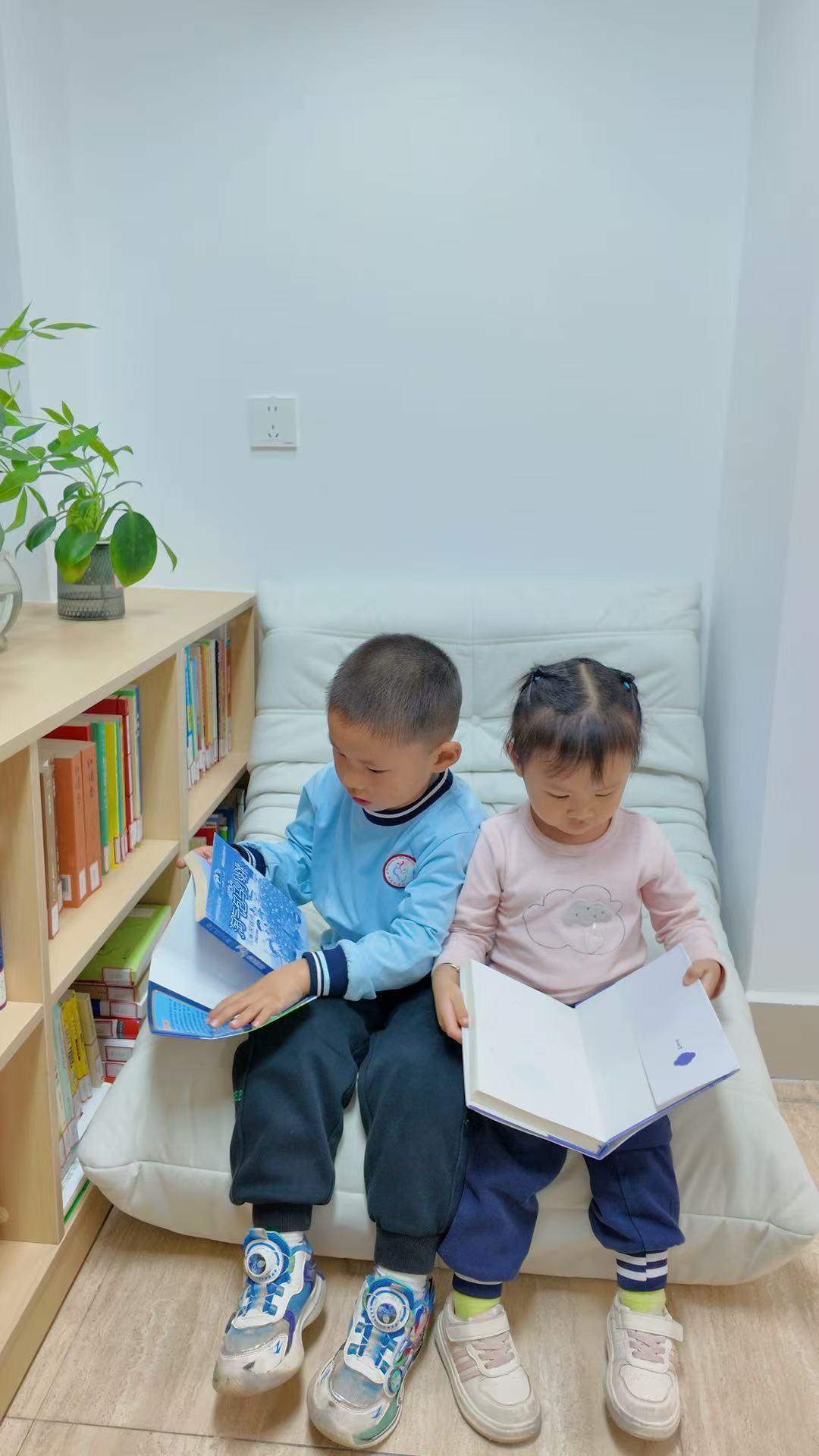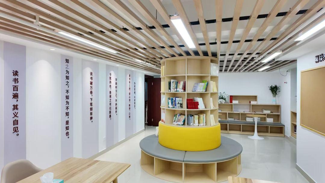 书架错落有致地分布在书房各处,书籍种类丰富,涵盖政治、历史、文学、科普、儿童读物等多个类别,满足不同年龄段居民的阅读需求。部分书架高度专为儿童设计,方便小朋友自主取阅,还可以放置书包。