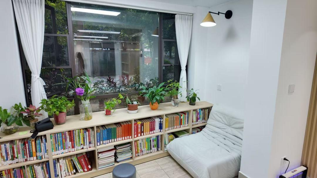 值得一提的是,书架上的绿植盆栽由居民捐赠,每盆都挂着小卡片,标注住户房号和浇水日期,生动诠释了“大家的书房大家建”的治理理念。