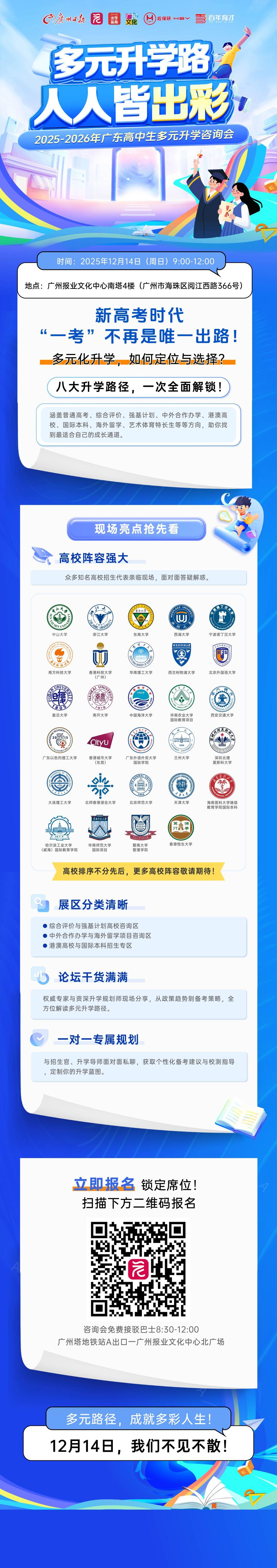 走好升学路,需要打开新思路,为帮助广东高中生及家长全面了解最新升学政策与多元路径,12月14日(星期日)由广州日报报业集团(广州日报社)主办的“2025-2026年广东高中生多元升学咨询会”将在广州报业文化中心举行。