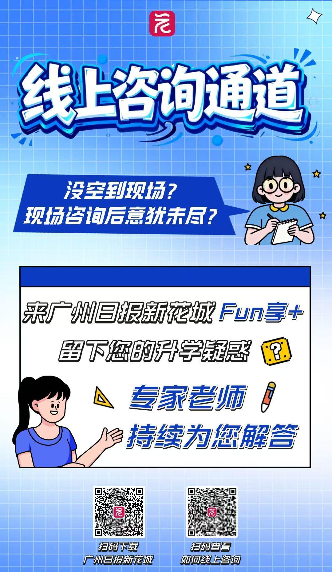 为了打破时空限制,让专业的升学指导更深入、更持续,本次活动特别在广州日报新花城客户端Fun享+板块,同步开设线上咨询通道。如果您无法来到现场,或在参加咨询会后意犹未尽,想继续深入咨询,这个“云咨询”通道将持续为您开放!