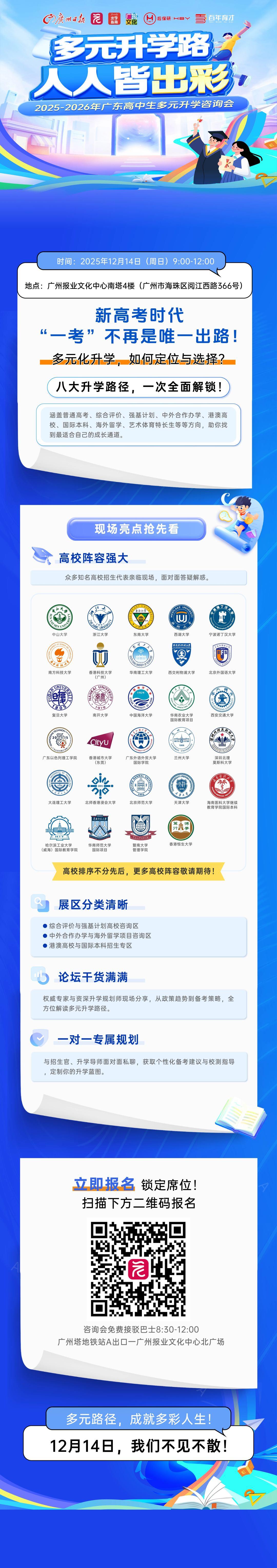 走好升学路,需要打开新思路,为帮助广东高中生及家长全面了解最新升学政策与多元路径,12月14日(星期日)由广州日报报业集团(广州日报社)主办的“2025-2026年广东高中生多元升学咨询会”将在广州报业文化中心举行。