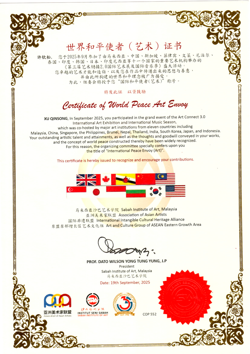 日前,著名山水画家、中国美术家协会顾问、广东省美术家协会名誉主席许钦松在马来西亚沙巴举办的“第三届艺术链接2.0国际艺术展和国际音乐季”活动中,被授予“国际和平使者(艺术)”荣誉称号。这一殊荣由沙巴艺术学院、亚洲美术家联盟、国际非物质文化遗产联盟以及东盟东部增长区艺术文化组联合颁发,充分肯定了许钦松在推动国际文化艺术交流、促进世界和平事业方面的卓越贡献。