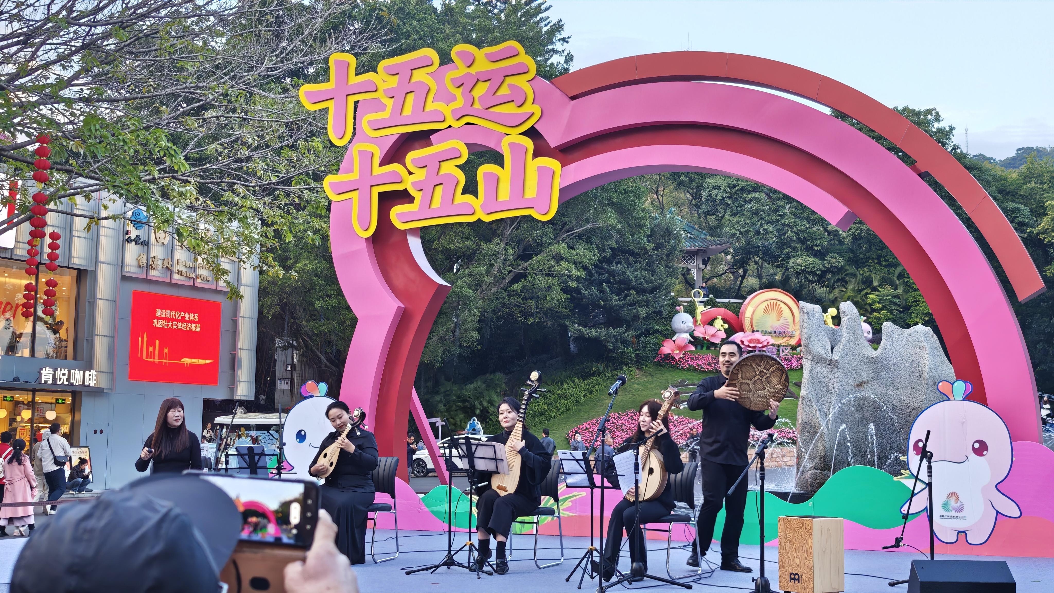 作为本次巡游的核心主场,白云山在启幕演出后持续升温。12月14日,景区推出《秋日音画》系列音乐会。演出以“登高赏秋”为主题,精选琵琶、柳琴、阮等弹拨乐器,通过《快乐老家》《玉津》等经典曲目,以清澈灵动的颗粒性音色,勾勒出山间秋色层林尽染的意境。音乐会使观众在聆听的同时,仿佛置身于一幅流动的山水音画之中,实现视听双重享受。