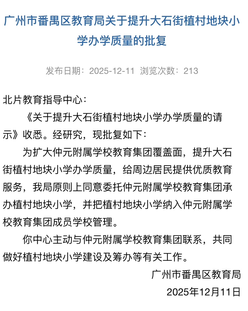 番禺区教育局在公告中指出,为扩大仲元附属学校教育集团的覆盖面,提升植村地块小学的办学质量,为周边居民提供更优质的教育服务,原则上同意委托该教育集团承办该校,并将其作为成员学校纳入管理体系。广东仲元中学作为始建于1934年的名校,是国家级示范性普通高中、广东省一级学校,并屡获“中国百强中学”等荣誉,已成为番禺教育的高质量标杆。其附属学校教育集团的入驻,有望显著带动该区域基础教育水平的整体提升。