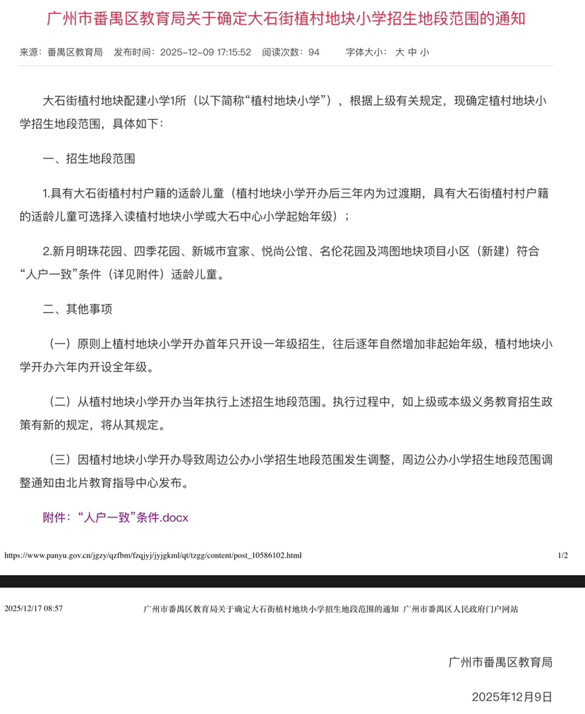 近日,广州市番禺区教育局发布文件,明确大石街植村地块配建小学(以下简称“植村地块小学”)的招生范围及管理归属。根据公告,该校建成后将正式纳入广东仲元中学附属学校教育集团,实行统一管理,标志着番禺区在推动优质教育资源共享、促进区域教育均衡发展方面迈出重要一步。