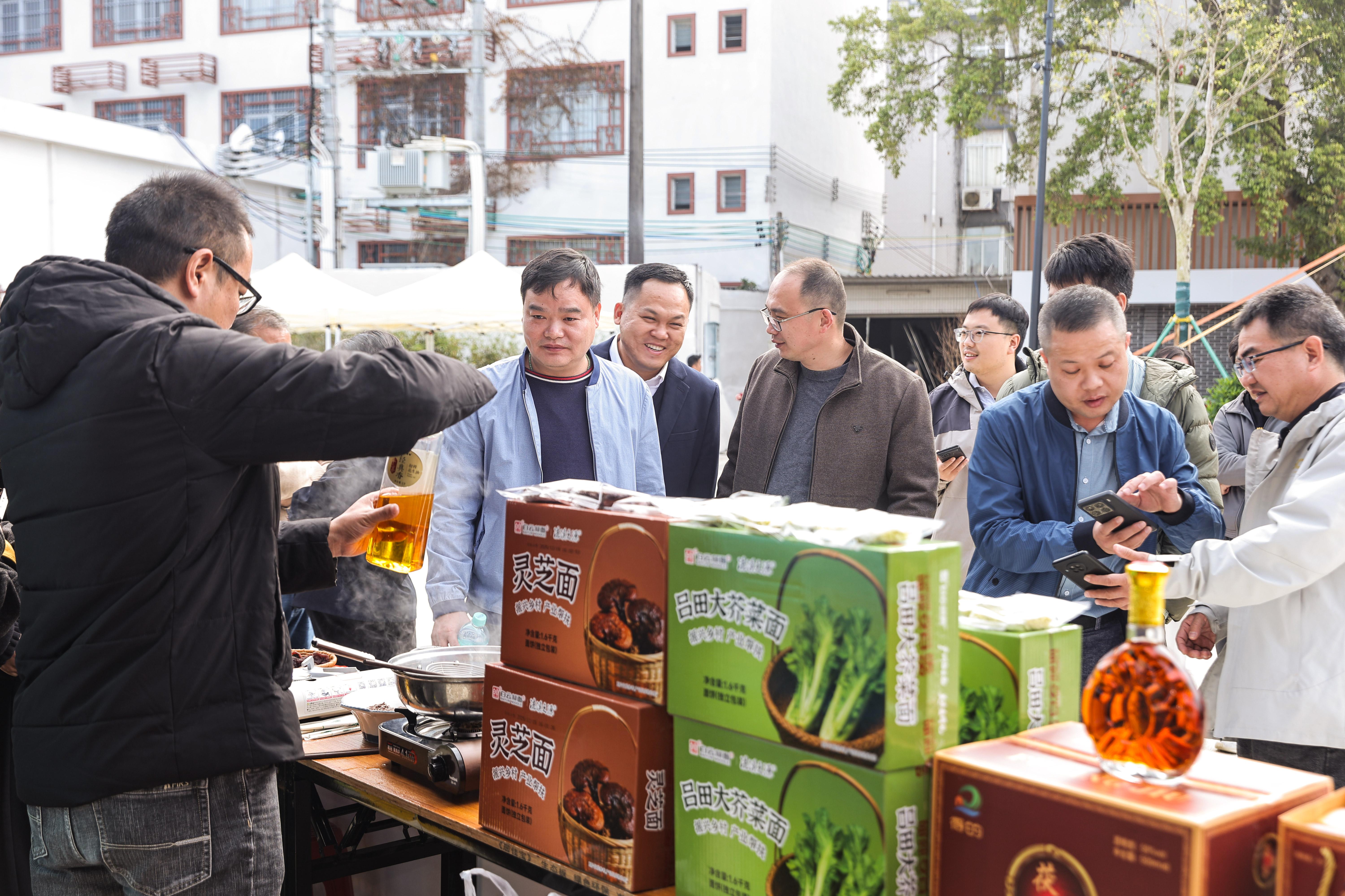 同期亮相的吕田镇美丽圩镇客厅也完成揭牌,这个集农产品展销、文化展示、旅游服务于一体的综合体,随即成为现场嘉宾争相参观的新地标。在“丰饶流溪,邂逅吕田”特色农产品展销区,流溪娟鱼、吕田头酒、富硒茶、柿子干等二十余种地道风物整齐陈列,不少游客当场选购,把吕田风味直接带回家。