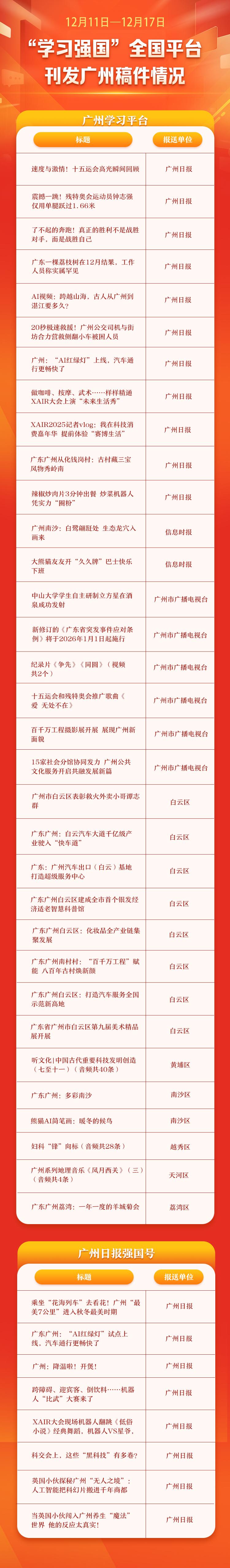 12月11日—12月17日,“学习强国”广州学习平台共有103条稿件(含音频)被全国平台选用,广州日报强国号共有8条稿件被全国平台选用。 制图:李思涵广州日报新花城编辑:李思涵