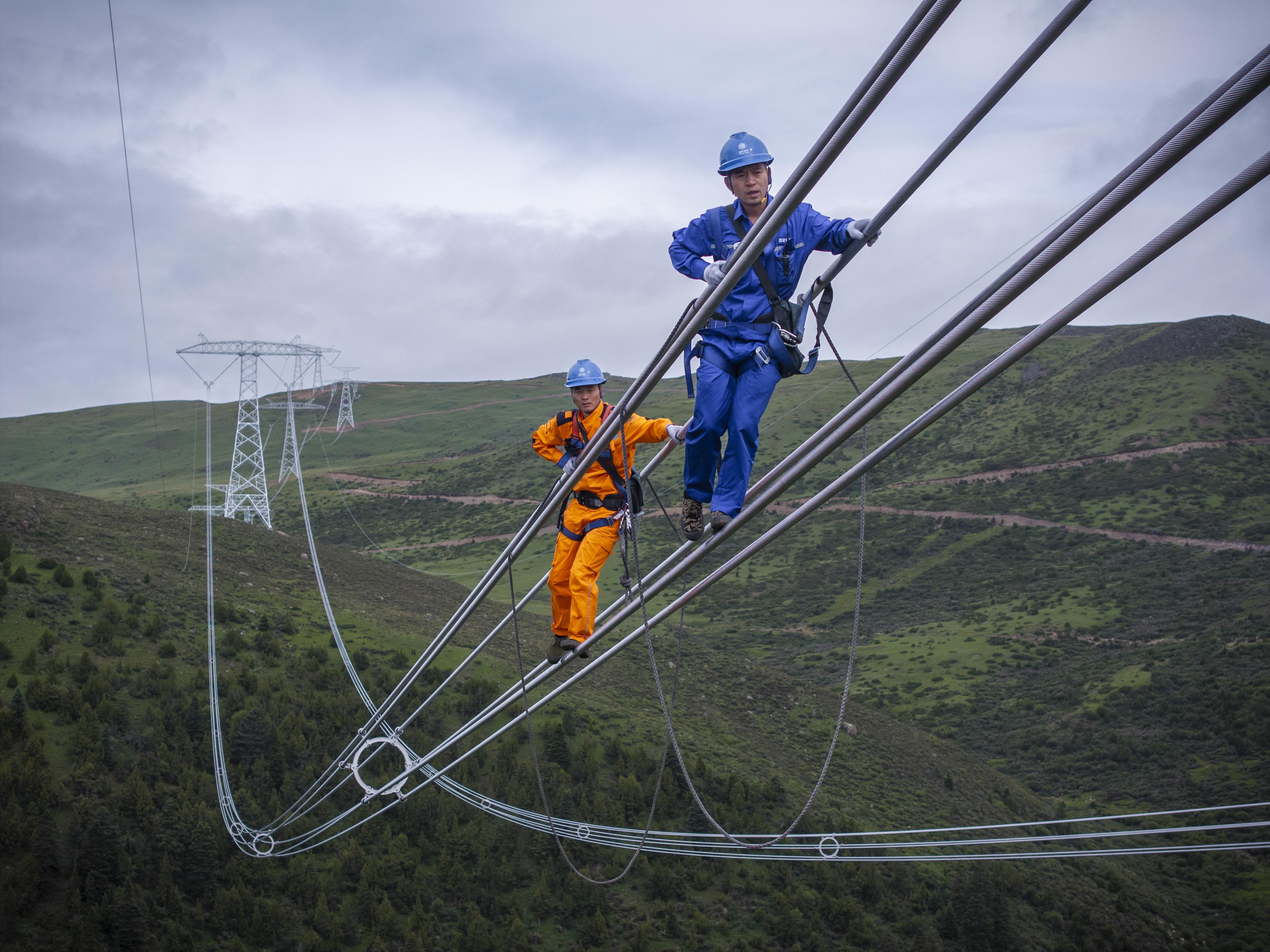 2025年7月1日,作业人员在金沙江上游—湖北±800千伏特高压直流输电工程四川甘孜段走线验收。郑自豪摄。