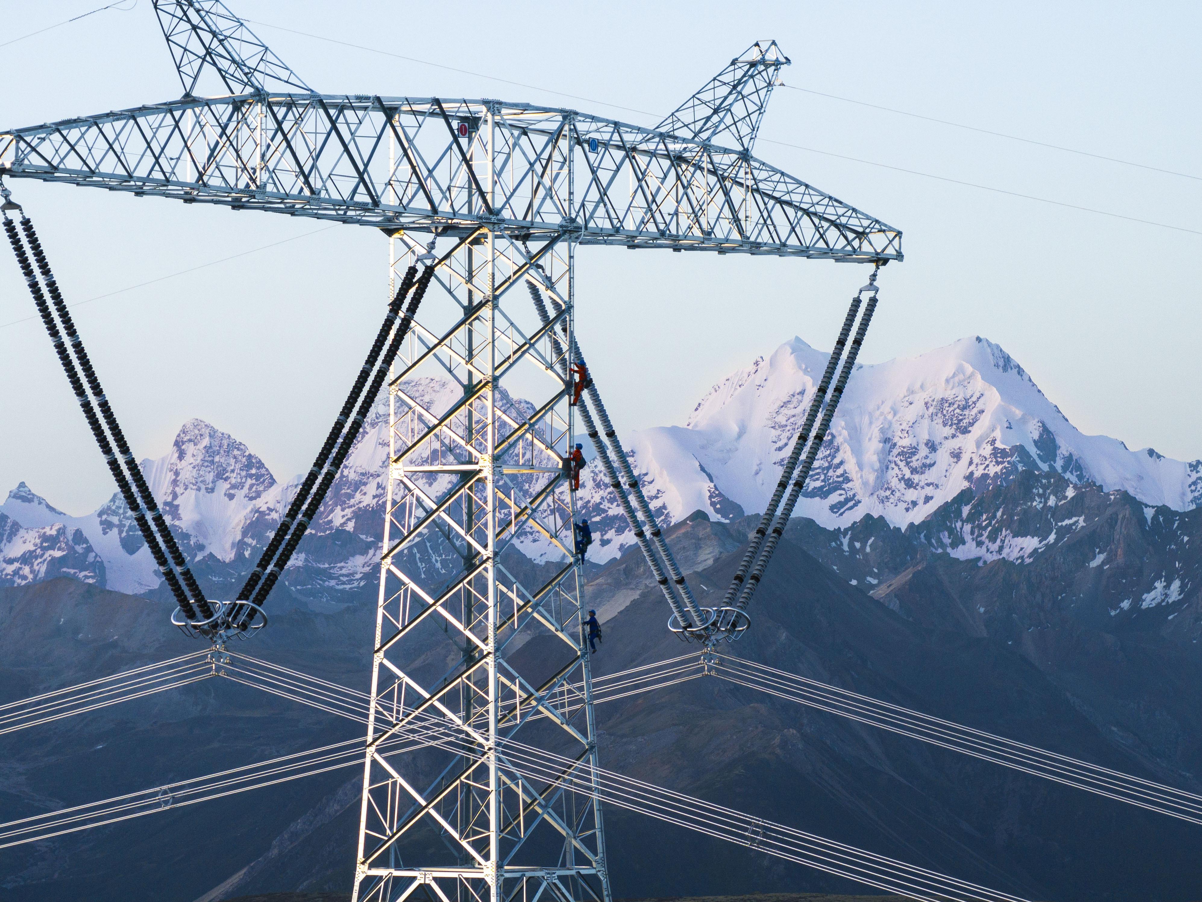2025年7月1日,作业人员在金沙江上游—湖北±800千伏特高压输电工程四川甘孜段登塔开展线路设备设施验收工作。郑自豪摄。