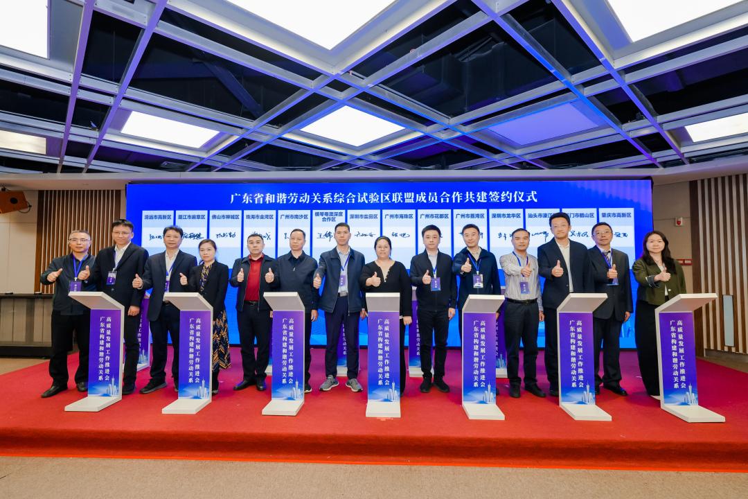 当天大会现场,广州海珠区、荔湾区、花都区、南沙区,深圳盐田区、龙华区,横琴粤澳深度合作区、珠海金湾区、汕头濠江区、佛山禅城区、江门鹤山市、湛江麻章区、肇庆高新区、清远高新区作为首批14家联盟成员单位共同签署《广东省和谐劳动关系综合试验区联盟成员合作共建协议》。各方约定,将秉持“目标同向、措施一体、优势互补、共治共享”原则,推动和谐劳动关系高质量发展经验交流走向深入,共同构建新时代劳动关系多元治理模式,推动劳动关系制度成果共建共享。会议同期举行粤港澳大湾区劳动争议联合调解中心及三个省级速调快裁服务站(广州琶洲、深圳前海、珠海横琴)战略合作协议签订仪式,未来三年,各方将共同探索粤港澳三地跨境法律规则衔接,建立适用机制,促进调解仲裁人才交流,推动构建“优势互补、资源共享、协同创新”的跨境协同治理新生态。