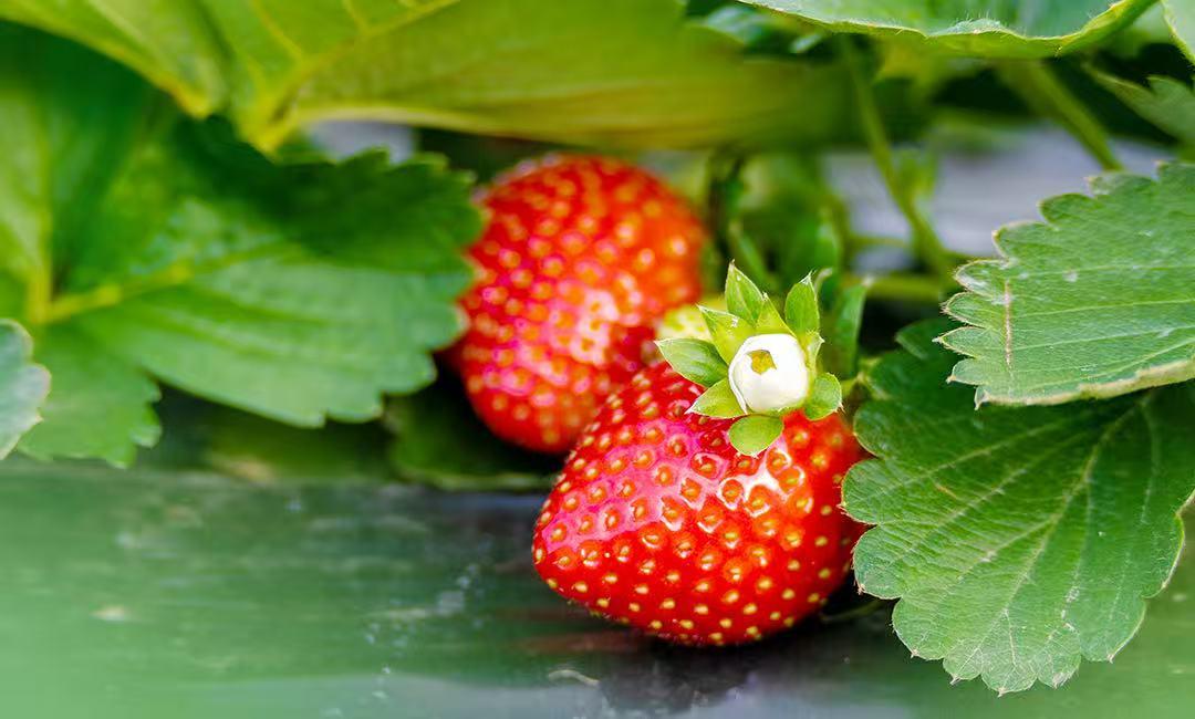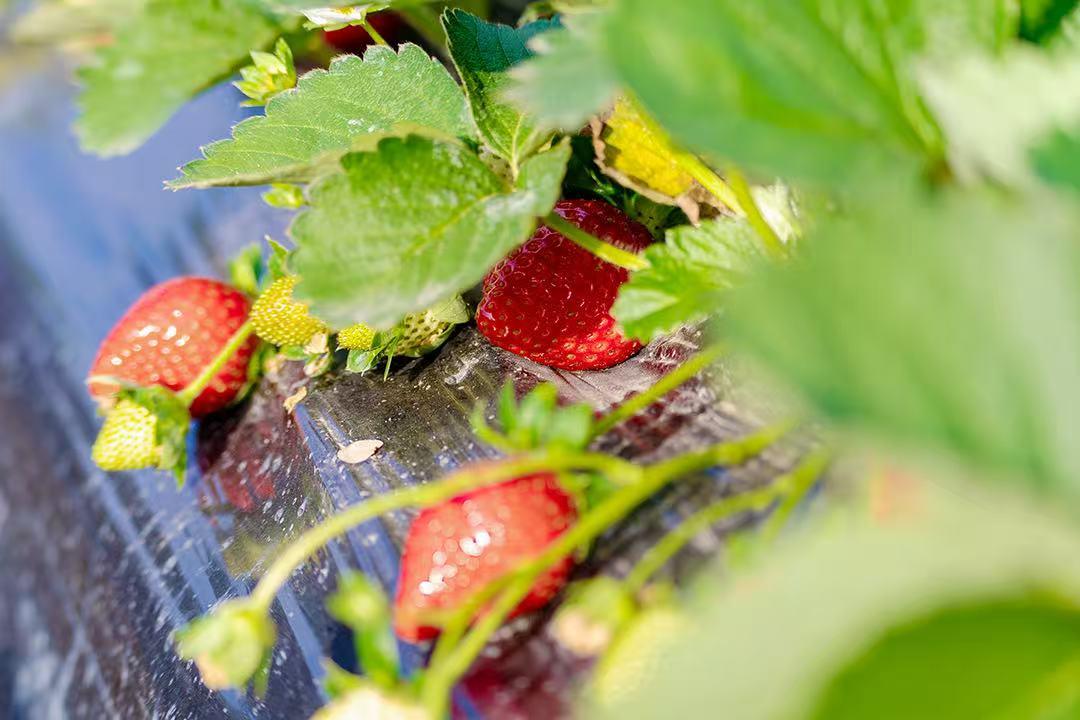 在钟落潭镇虎塘村,天天草莓采摘园田垄开阔,翠绿的藤蔓在阳光下舒展,鲜红的草莓点缀其间,果蒂旁还挂着没有褪尽的白色小花,美得像一幅小画。