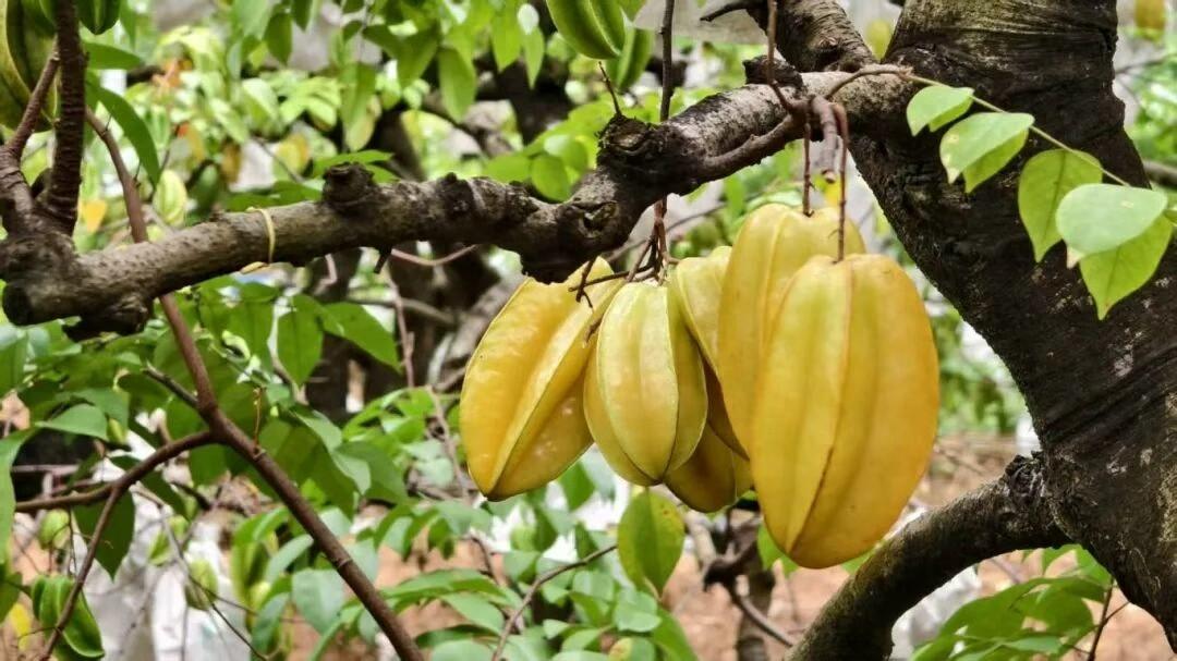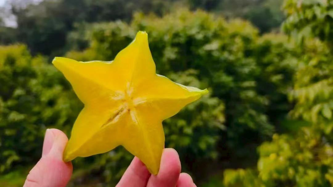 近日,位于增城区正果镇水口村的马来西亚红杨桃种植基地迎来了丰收季,一颗颗形如“五角星”的红杨桃遍布基地。