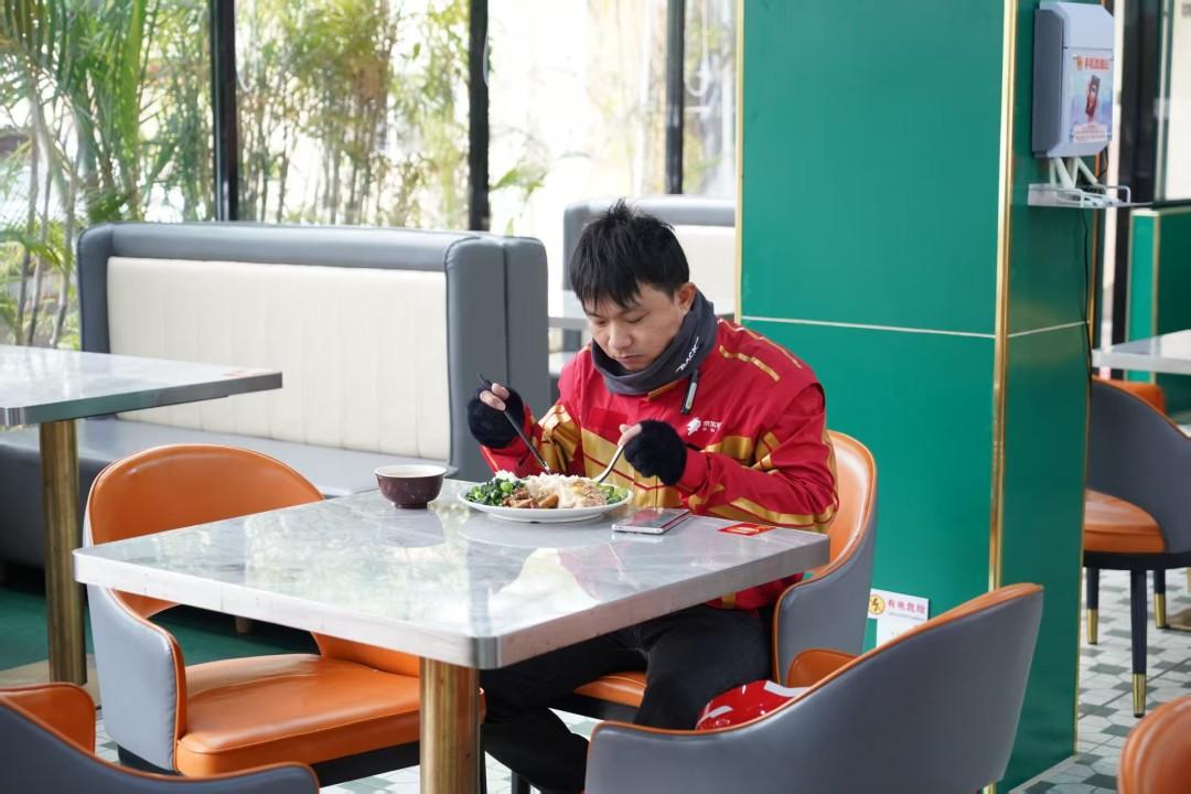快递小哥王先生表示:“我之前就经常在对面那个驿站休息,现在还能来这边吃口热饭,太方便了!这里的菜都是家常口味,比自己做饭省心很多。”