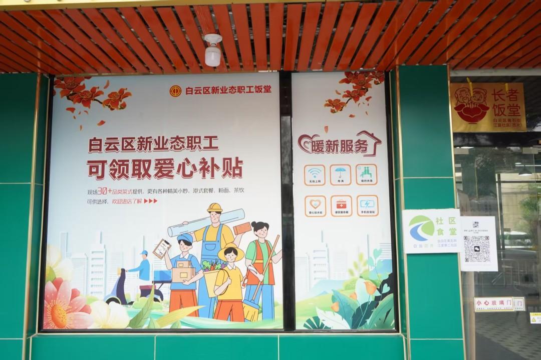 白云区新业态职工饭堂位于黄石街,毗邻江夏快递小哥驿站,是在广州市总工会指导下,由白云区总工会和黄石街联合打造,为辖区内外卖骑手、快递员、网约车司机等新业态劳动者提供了一个便捷、实惠、安心的就餐选择。