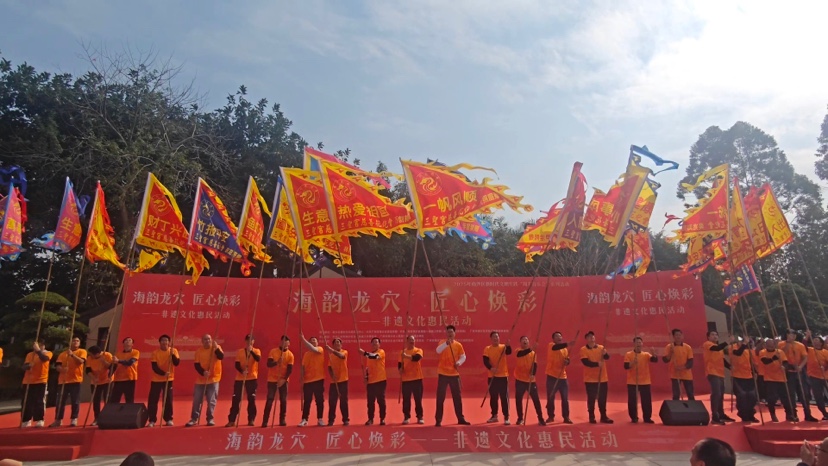 活动压轴环节——打旗表演。数十面彩旗在广场上骤然展开,“一帆风顺”“人康家宁”“身体健康”“四季平安”等祝福语随风舒展,红的热烈、黄的鲜亮,组成流动的彩虹。表演者们时而列队前行,时而变换阵型,挥舞彩旗,彩旗猎猎声与观众欢呼声、远处港口的汽笛声交织在一起。乡亲们纷纷举起手机记录,掌声此起彼伏,打旗表演的气势与之前香云纱走秀、粤剧《双飞燕》、咸水歌、英歌舞等非遗展演的余韵相融,生动诠释着龙穴文化的深厚底蕴与时代活力。