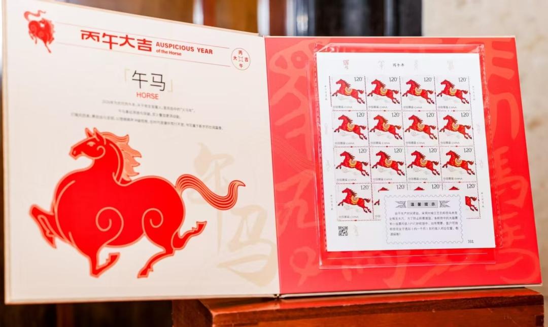 《丙午年》特种邮票由中国邮政发行,由王红卫、赵恩重设计。邮票中的骏马既展现出“一马当先”的开拓气概,也诠释了“万马奔腾”的团结力量,将马的形象与新时代中国人民奋发进取的精神风貌完美融合于方寸之间。