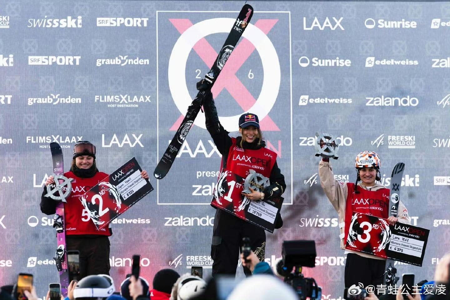 此次夺冠后,谷爱凌解锁了个人的“世界杯20冠”成就,涵盖了自由式滑雪U型场地技巧、坡面障碍技巧和大跳台三个项目,她也成为国际雪联历史上首位取得此项成就的自由式滑雪运动员。