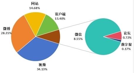在信息传播渠道上,“消费维权”类信息传播渠道主要有视频、微博、网站、客户端、微信、论坛、数字报等。其中视频信息量最高,占比34.13%;其次是微博,占比28.35%;第三是网站,占比14.68%。