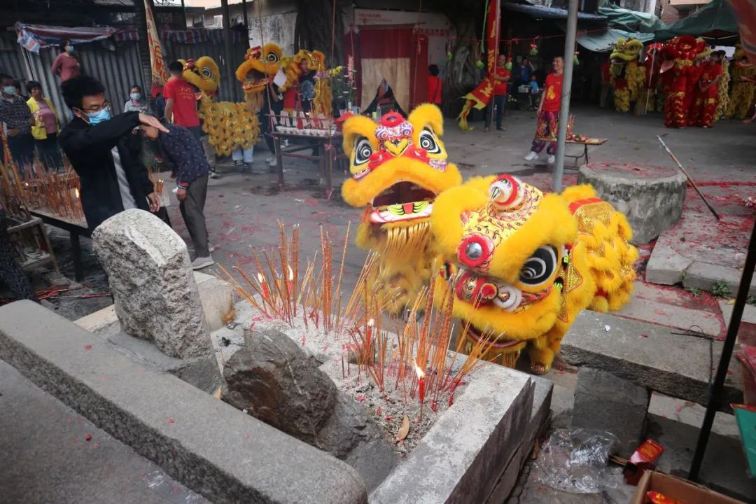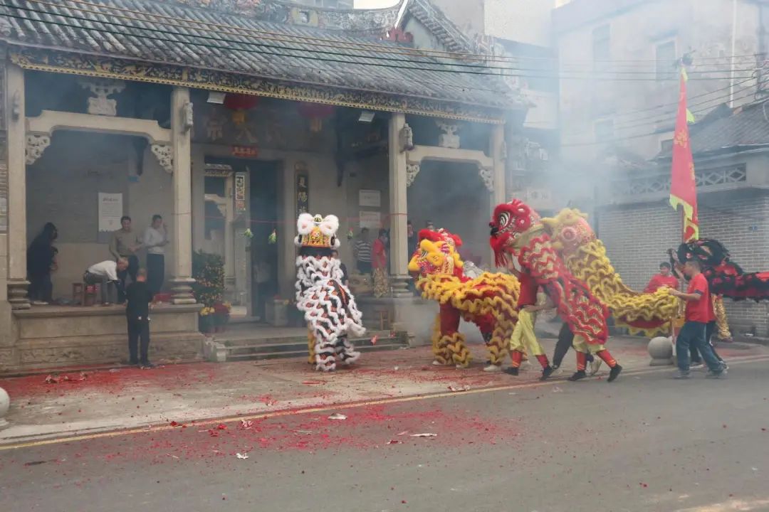 醒狮在华光庙前表演。