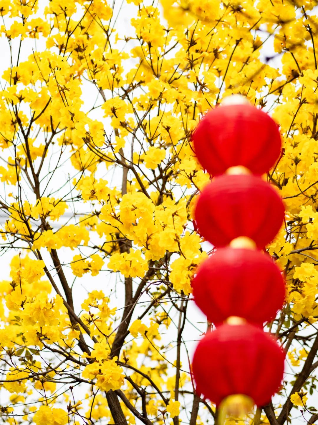 金黄色的花朵与红色迎春灯笼一起随风招展,在阳光下闪耀着“金光”,把街道装扮得热闹喜庆。