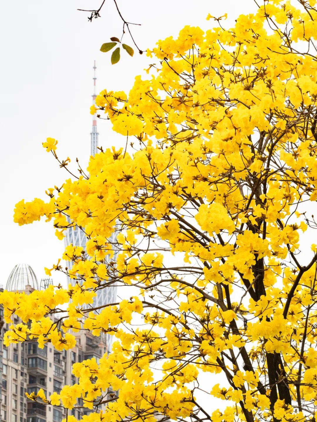 不止磨碟沙路,洲头咀公园、海珠区环岛路、广报路和海珠区党建公园等地的黄花风铃木也相继进入了开花阶段。