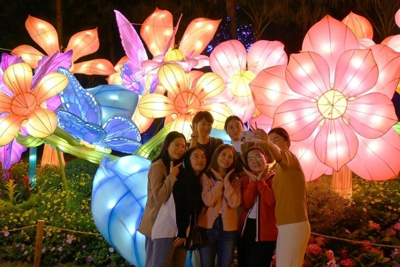 市民游客打卡“繁花似锦”,该灯组以大量广州市花木棉花和春日名片桃花为主体鲜活立体,沿途为游客铺设了一条花路,代表着三年磨一剑的新春灯会已等到春暖花开。