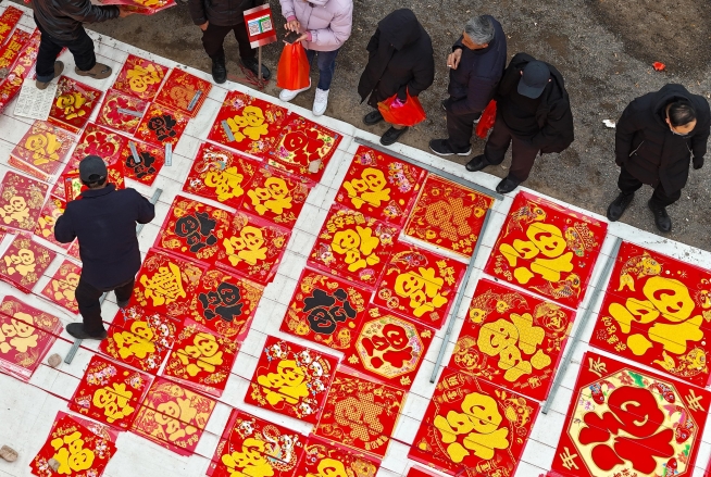 2月3日,市民在青岛西海岸新区泊里大集选购福字。张进刚 摄