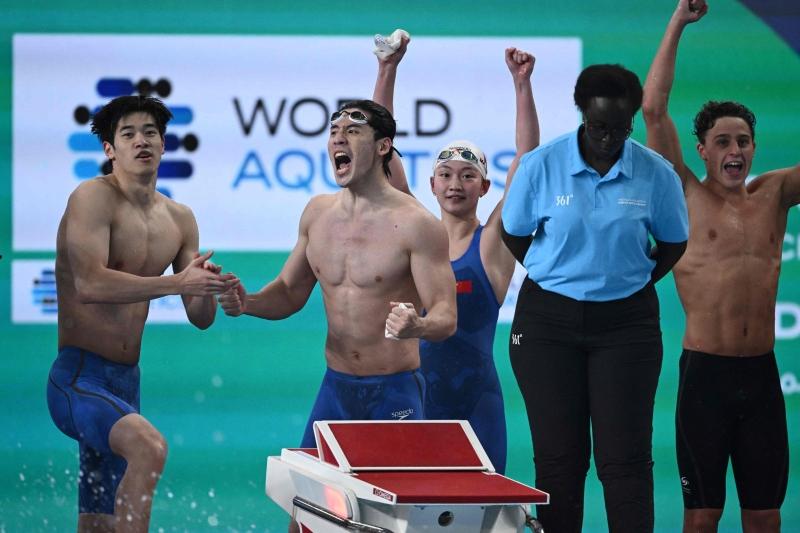 北京时间2月18日凌晨,中国游泳队在多哈游泳世锦赛的夺金之旅仍在继续。在当日压轴举行的男女混合4X100米自由泳接力决赛上,由潘展乐、王浩宇、李冰洁、余依婷组成的中国队一路领先,最终以3分21秒18的成绩夺冠,并继预赛之后再次打破该项目亚洲纪录。 视觉中国