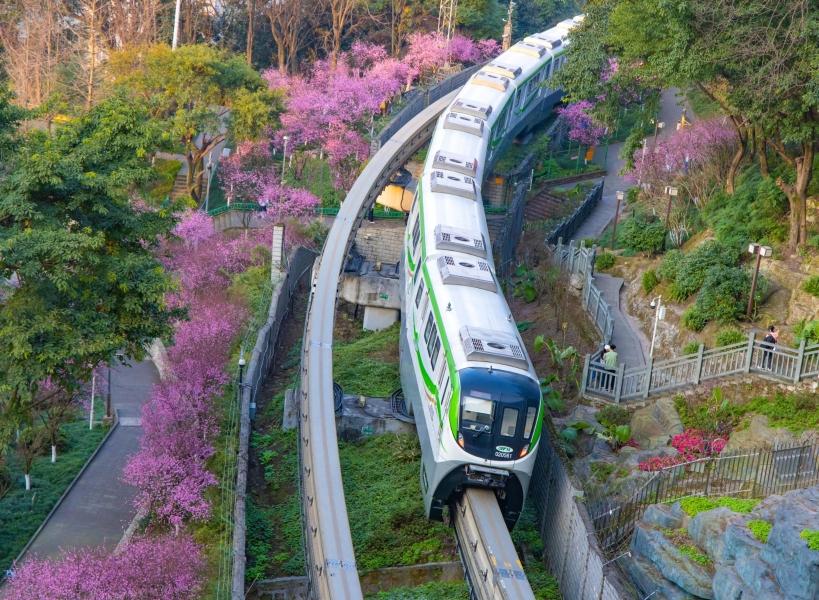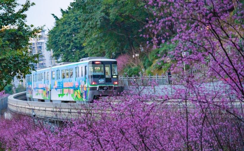 2024年2月19日,重庆,轨道2号线、3号线旁的美人梅相继绽放,列车穿行其间仿佛“开往春天”。视觉中国