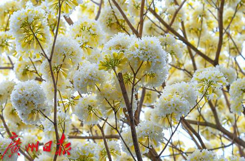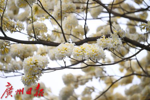 近日,在余荫山房景区,一株白花风铃木正惊艳绽放,花儿密密麻麻,大朵大朵簇拥于枝头,向人们送上早春的问候。