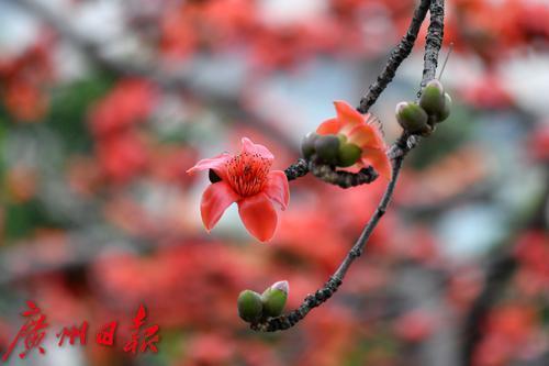 近期,广州城中各处木棉花纷纷进入盛花期,天河区桃园路村口的几棵木棉树此时也次第开花,硕大的花朵挂在树上,满树红艳,街坊推窗即可赏看红棉。