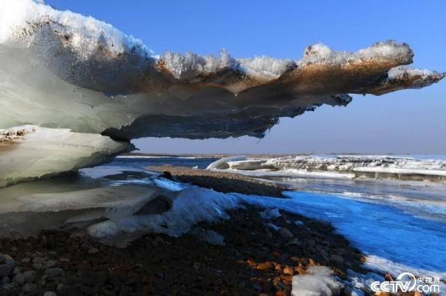 2024年3月11日,吉林市,松花江舒兰、九台江段目前正是开江时节,搁浅在岸的冰面融化,形成冰挂。视觉中国