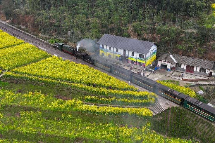 2024年3月12日,四川省乐山市犍为县,一列嘉阳小火车经过段家湾油菜花海,吸引众多游客拍照。连日来,四川省犍为县被誉为“工业革命的活化石”的窄轨蒸汽小火车铁路沿线的油菜花开得正艳,慕名而来的八方游客赏花踏青,感受春天的气息。视觉中国