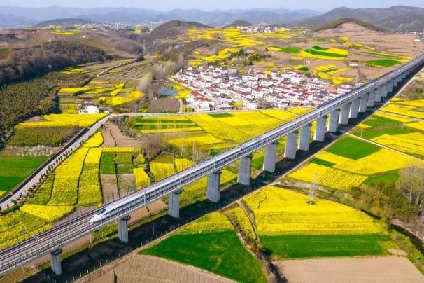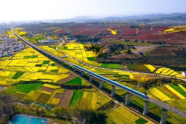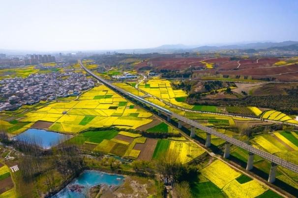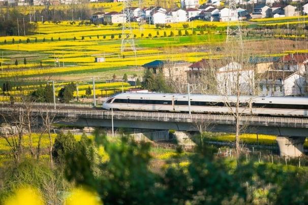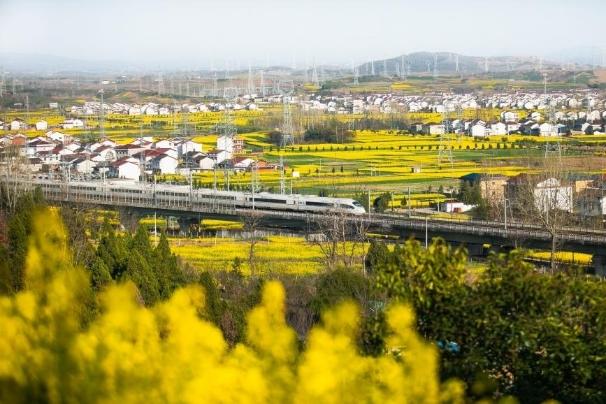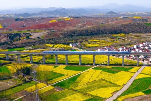 一列列动车组列车沿着西成高铁风驰电掣。当动车与油菜花田同框时,一幅绝美的现代田园春景图映入眼帘。