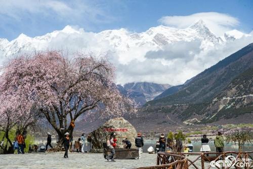 2024年4月1日,西藏林芝,米林市境内的南迦巴瓦峰下,桃花盛开,吸引了众多游客前来游玩。视觉中国